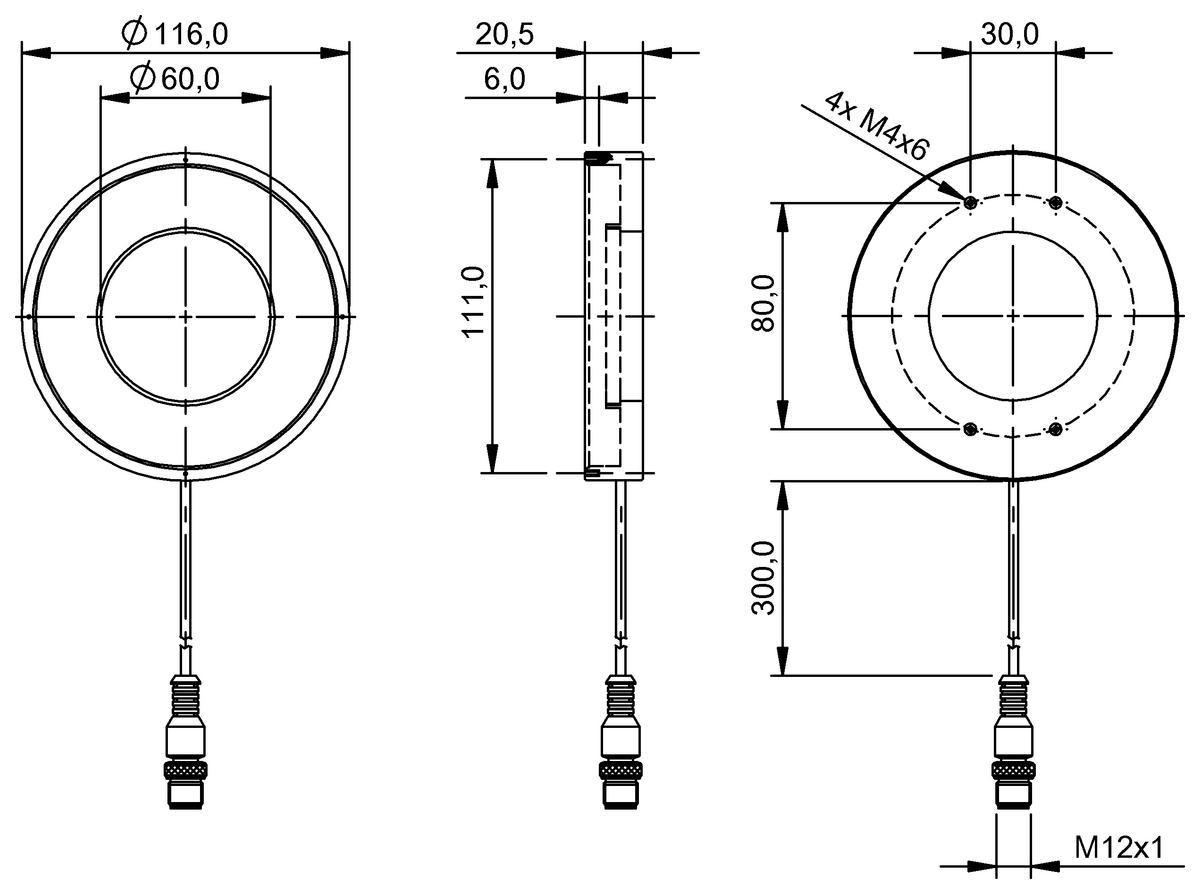 BAE000K (BAE LX-VS-RI100) - Ring lights - List price Deutschland: 825,83 EUR - Connection: Cable with connector, M12x1-Male, 4-pin, 0.3 m, Version: Ring light, Dimension: Ø 116 x 20.5 mm, Rated operating voltage Ue DC: 24 V, Current draw max.: 750 mA, 1370 mA (Boost mode), Operating mode: Normal (continuous operation), Boost (continuous operation with cooling), Digital inputs: Trigger, Material: Aluminium anodized, black, Glass, Illumination area: Ø 100 mm/Ø 60 mm, Light type: LED infrared, Wave length: 875 nm, Beam angle: 30 °, Ambient temperature: -10...55 °C, Approval/Conformity: CE, UKCA, WEEE, IP rating: IP54
