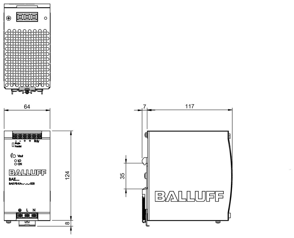 BAE0006 (BAE PS-XA-1W-24-050-003) - Power supplies for the control cabinet - List price Deutschland: 110,57 EUR - Dimension: 64 x 124.5 x 116.6 mm, Version: DIN rail, Mounting part: DIN rail mount, Housing material: Metal, Connection: Terminal, 0.25...4 mm², Input voltage: 115/230 V AC automatic selection, Rated output voltage DC: 24 V, Rated output current: 5 A, IP rating: IP20, Approval/Conformity: CE, CCC, cULus, WEEE, Ambient temperature: -35...70 °C